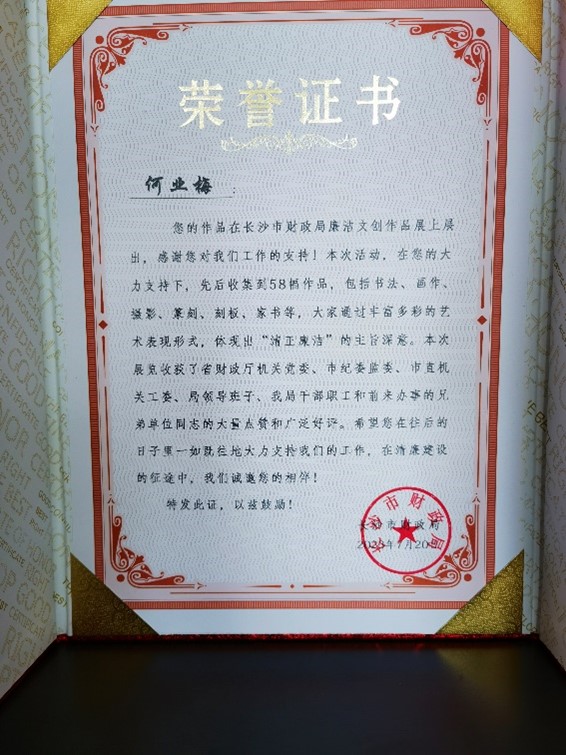 长沙市财政局给与何业梅同志颁发荣誉证书,以兹鼓励。