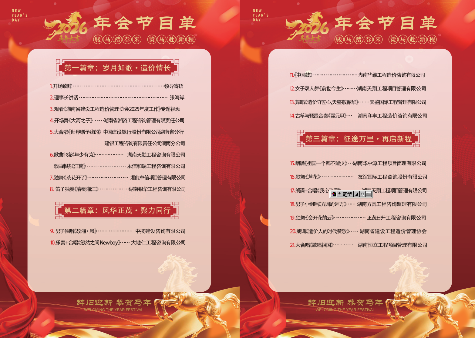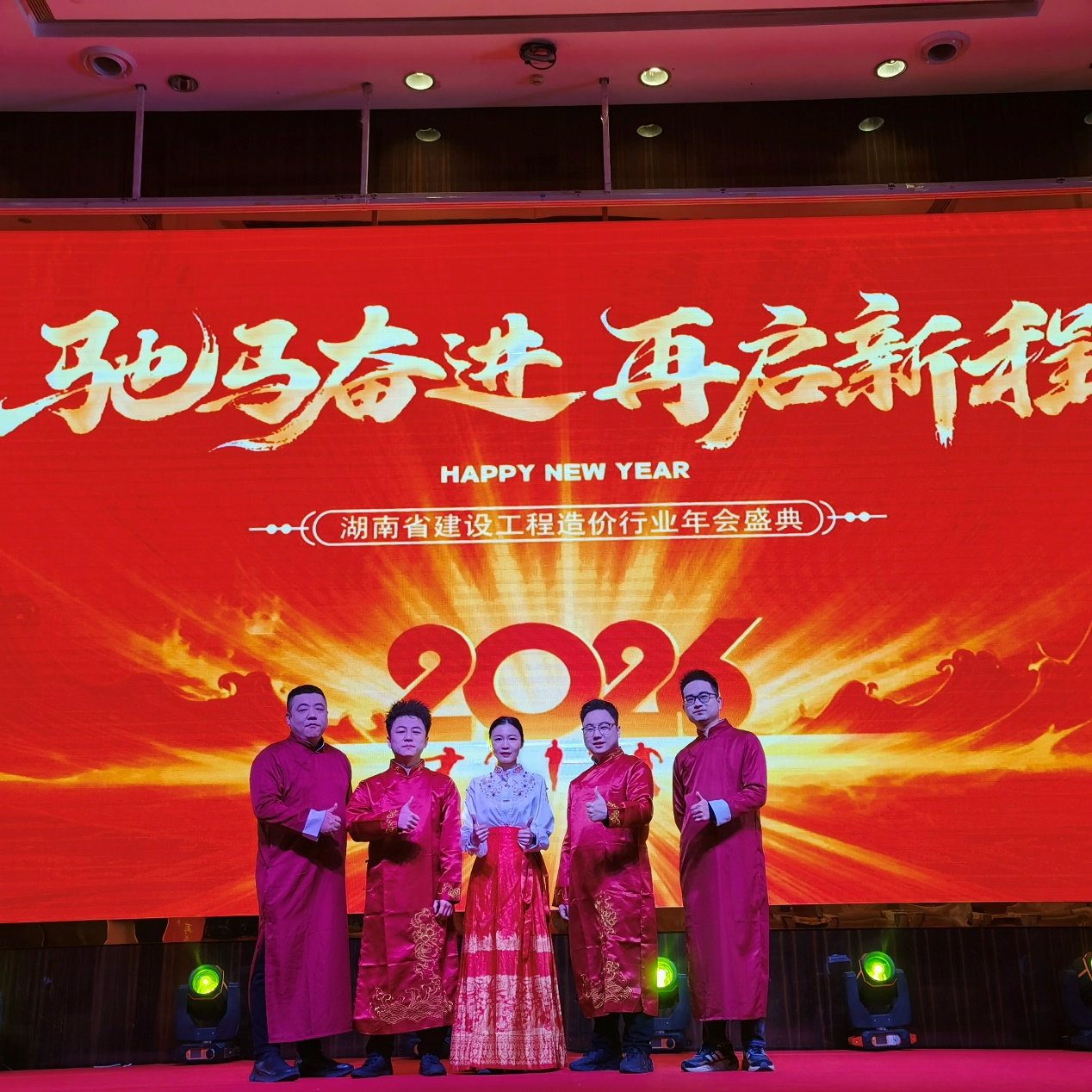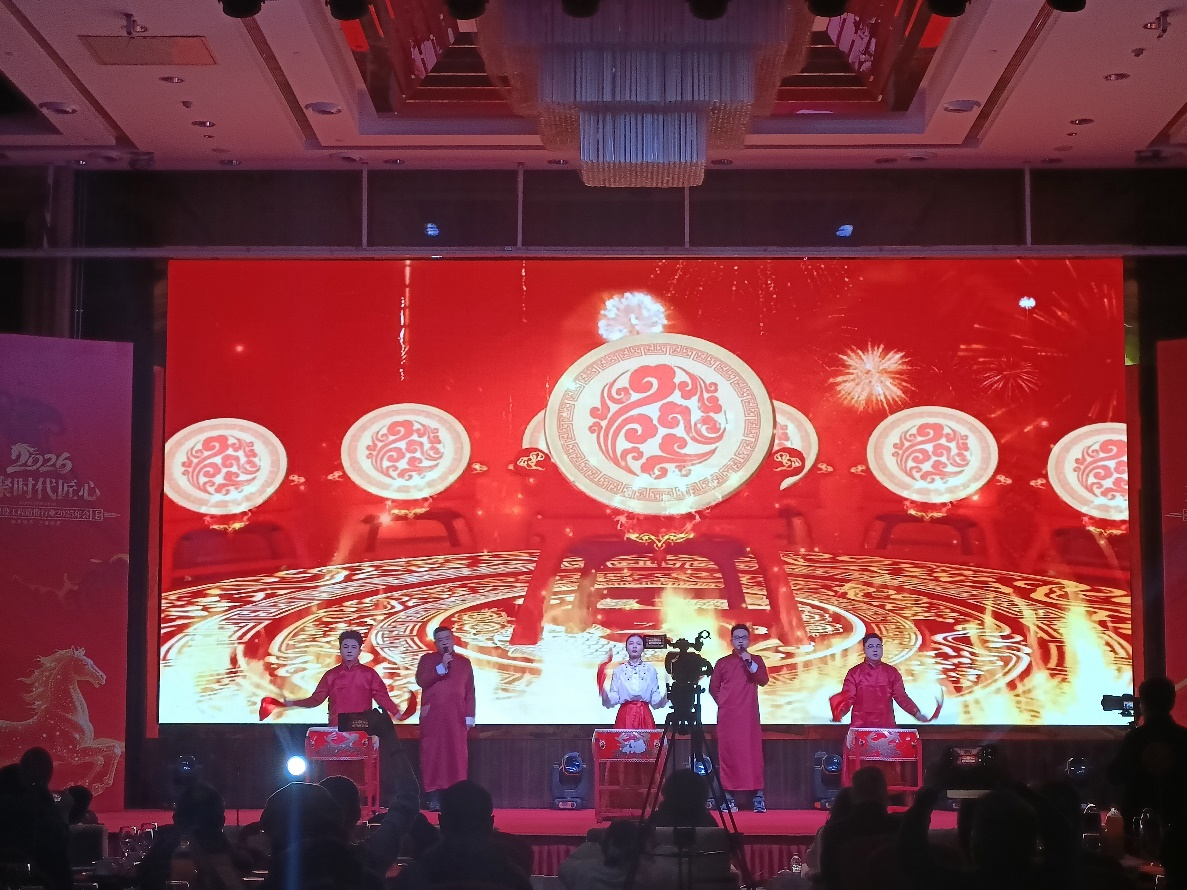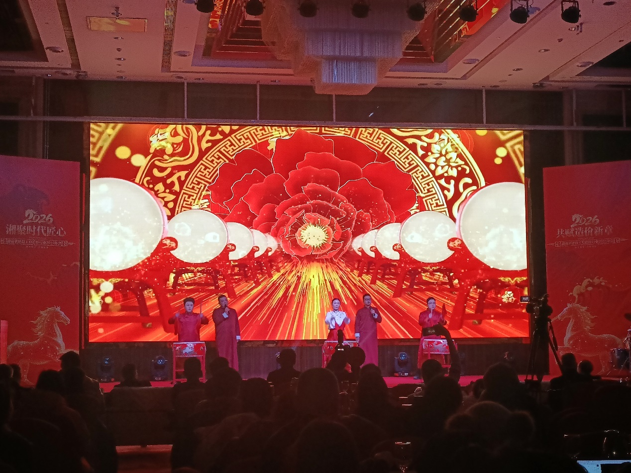 2026年1月23日湖南省建设工程造价行业年会盛典文艺汇演圆满落幕,本次年会以“驰马奋进 再启新程”为核心主题,汇聚全省造价行业同仁共叙过往、共启新篇,现场氛围热烈。我司选派高任滨、徐皓、王淑玉、贾斌、郝振东五位同志组成演出队伍,携中国鼓节目登台亮相,凭借超水准发挥惊艳全场,圆满完成演出任务,赢得满堂喝彩!